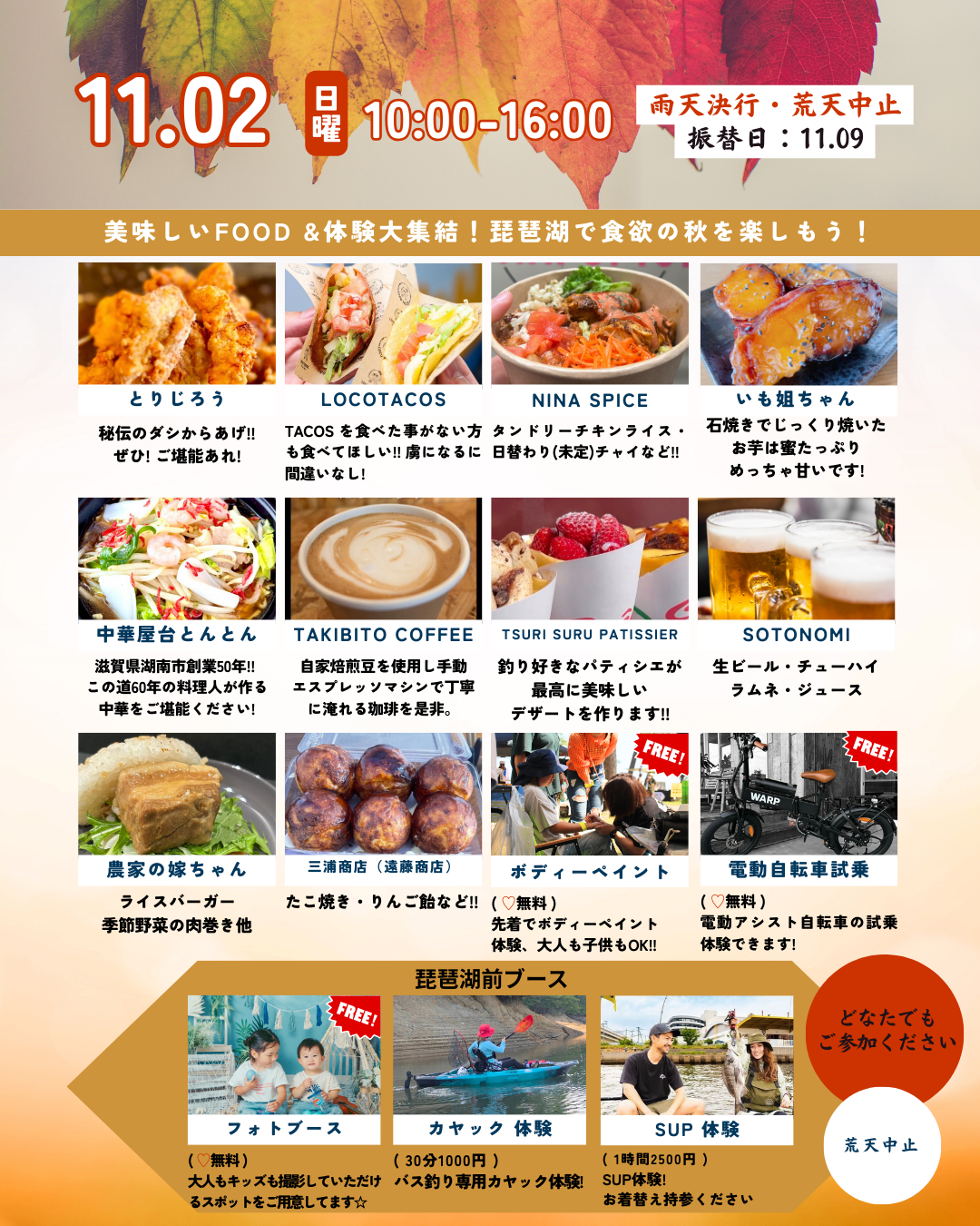 人気キッチンカーも勢揃いしておりますので、 スローで贅沢な湖畔時間を味わって下さい。